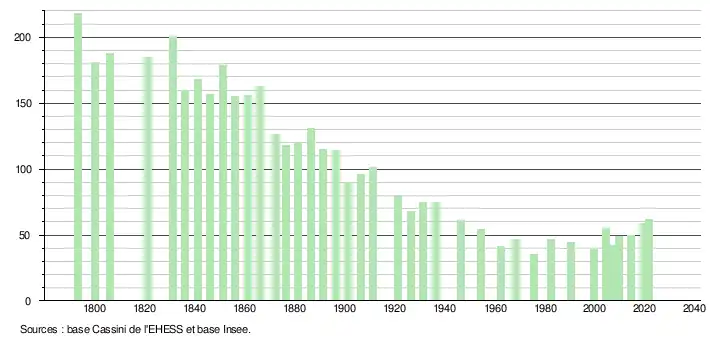 L'évolution du nombre d'habitants est connue à travers les recensements de la population effectués dans la commune depuis 1793. Pour les communes de moins de 10 000 habitants, une enquête de recensement portant sur toute la population est réalisée tous les cinq ans, les populations légales des années intermédiaires étant quant à elles estimées par interpolation ou extrapolation[18]. Pour la commune, le premier recensement exhaustif entrant dans le cadre du nouveau dispositif a été réalisé en 2004[19].