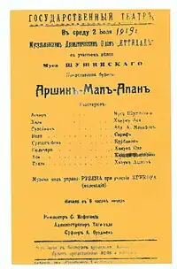 D'autre part, l'air d'ouverture d'Asker et quelques rôles vocaux sont faits à l'européen. La première de l'opérette Archine mal alan s'est tenue en 1918, dans le théâtre de Zeynalabdine Taghiyev. Plus tard, «Archine mal alan » a été traduite en 75 langues et mise en scène dans 187 théâtres des 76 pays : dans 16 villes de Géorgie, 17 villes de Bulgarie, 13 états des États-Unis, 17 villes de Pologne (1500 fois), dans 28 villes de Russie, 8 villes de Chine etc[25],[26],[27],[28],[29]. En 1919 la troupe des frères Hadjibeyov était en tournée à Istanbul, en Turquie. Cette tournée était tellement réussie, que les acteurs azerbaïdjanais ont dû louer le théâtre «Sharg» («Orient») pour quelques mois à Istanbul. Il faut également évoquer la mise en scène de l'opérette Archine mal alan dans le théâtre parisien «Fémina», dont la première a eu lieu le . La traduction a été faite par Jeyhun bek, le frère de l'auteur. Les acteurs français interprétaient les rôles : Derval (Sultan-bek), Monte (Asker), Passani (Gultshohra), Magali (Assya) et d'autres. Un dramaturge polonais connu S. Povolotski se souvient :