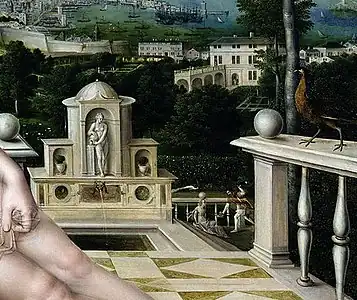 - Enfin, dans le jardin, à droite de Vénus, on voit un couple amoureux ; un homme soulevant son chapeau et s'agenouillant devant une femme assise dans l'escalier. En raison des changements dans les pigments de couleur, ils apparaissent aujourd'hui presque transparents.
