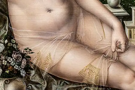 Le style élégant et sensuel est conforme au goût de la culture de cour française et nord-européenne. Le corps allongé de la femme, les doigts fins, la tête relativement petite aux yeux en amande et la coiffure sont des traits stylistiques distinctifs de l'école de Fontainebleau.