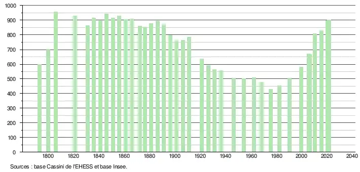 L'évolution du nombre d'habitants est connue à travers les recensements de la population effectués dans la commune depuis 1793. Pour les communes de moins de 10 000 habitants, une enquête de recensement portant sur toute la population est réalisée tous les cinq ans, les populations légales des années intermédiaires étant quant à elles estimées par interpolation ou extrapolation[34]. Pour la commune, le premier recensement exhaustif entrant dans le cadre du nouveau dispositif a été réalisé en 2005[35].