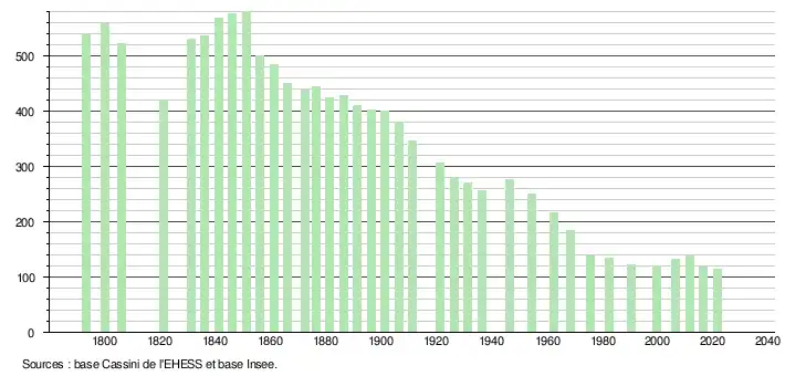 L'évolution du nombre d'habitants est connue à travers les recensements de la population effectués dans la commune depuis 1793. Pour les communes de moins de 10 000 habitants, une enquête de recensement portant sur toute la population est réalisée tous les cinq ans, les populations légales des années intermédiaires étant quant à elles estimées par interpolation ou extrapolation[15]. Pour la commune, le premier recensement exhaustif entrant dans le cadre du nouveau dispositif a été réalisé en 2006[16].