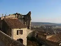Le château est situé au sommet de la colline, tandis que l'agglomération s'étendit sur le flanc sud autour d'une voie de circulation principale.