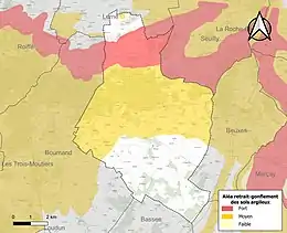 Les mouvements de terrains susceptibles de se produire sur la commune sont des affaissements et effondrements liés aux cavités souterraines (hors mines) et des tassements différentiels[20]. Afin de mieux appréhender le risque d’affaissement de terrain, un inventaire national permet de localiser les éventuelles cavités souterraines sur la commune[21]. Le retrait-gonflement des sols argileux est susceptible d'engendrer des dommages importants aux bâtiments en cas d’alternance de périodes de sécheresse et de pluie[22]. 61,3 % de la superficie communale est en aléa moyen ou fort (79,5 % au niveau départemental et 48,5 % au niveau national)[Carte 2]. Depuis le , en application de la loi ÉLAN, différentes contraintes s'imposent aux vendeurs, maîtres d'ouvrages ou constructeurs de biens situés dans une zone classée en aléa moyen ou fort[Note 2],[23].