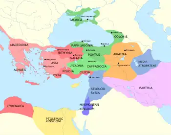 Rome avait été invitée à arbitrer des différends de longue date entre le royaume de Bithynie et le royaume du Pont, qui étaient situés côte à côte sur la rive sud de la mer Noire. Les familles dirigeantes de chacun de ces royaumes descendaient de satrapies persanes non incorporées dans l'empire d'Alexandre le Grand. Des troupes romaines avaient été invitées en Anatolie en tant qu'alliés de la république de Rhodes qui y avait des avoirs. Maintenant qu'elles étaient là, les deux rois ont décidé de demander au Sénat romain de régler leur différend.