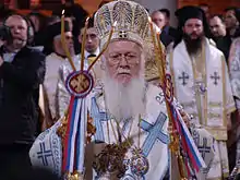 - Omophorion (en grec : ώμοφόριον) : Large et longue bande d'étoffe de soie, brodée et ornée de croix, que les patriarches et les métropolites portent autour du cou depuis les premiers siècles.