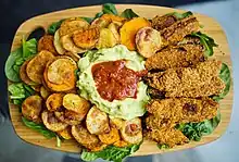 Les produits à base de soya (tofu, edamame, etc.), les autres légumineuses (lentilles, pois, haricots secs, etc.), les grains entiers (quinoa, sarrasin, sésame, lin, etc.) et les noix (amande, noix de Grenoble, noix de cajou, etc.) sont riches en protéines[93]. Ces protéines ont un contenu variable en acides aminés essentiels (acides aminés non ou insuffisamment synthétisés par le corps humain), certains d'entre eux pouvant être considérés comme « limitants » : les acides aminés soufrés (méthionine et cystéine) dans la plupart des légumineuses ; la lysine dans les céréales ; le tryptophane dans le maïs. Une alimentation végétale variée, notamment une alimentation associant céréales et légumineuses, permet toutefois d'équilibrer l'apport alimentaire quotidien en acides aminés[92].