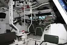 Le conducteur est situé à l'avant gauche du véhicule. Une deuxième place est installée à sa droite. Le conducteur peut voir la route depuis un grand pare-brise central ainsi que par deux vitres situées de part et d'autre de ce dernier. Des grilles de protection sont installés pour les opérations de maintien de l'ordre. En cas de combat, des volets blindés peuvent être positionnés devant les vitrages. Dans ce cas, la vision se fait par trois épiscopes situés sur le toit[10].