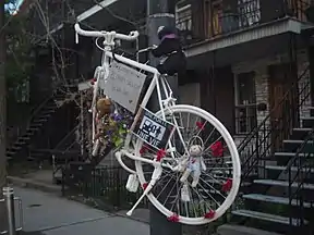 À Montréal (Québec), le collectif Vélo fantôme créé en 2013 par Gabrielle Anctil et Hélène Lefranc pose des vélos peints en blanc afin d'honorer la mémoire d’une personne décédée sur la route. Ce geste devient un symbole qui « suscite une réflexion sur les dangers des véhicules motorisés »[11]. Le , le collectif enlève pour la première fois depuis son existence un vélo fantôme, celui posé sept ans plus tôt en hommage à Mathilde Blais[12], décédée le sous les roues d'un camion alors qu'elle empruntait le viaduc de la rue Saint-Denis qui passe sous la voie ferrée du Canadien Pacifique. La création du Réseau express vélo, un aménagement cyclable d'envergure à Montréal qui consiste en un réseau de pistes cyclables protégées de la circulation automobile, a incité le collectif à retirer le vélo fantôme afin de saluer le nouvel aménagement sécuritaire (qui aurait épargné la vie de Mathilde Blais s'il avait existé en 2014), mais aussi avec l'objectif de presser la ville à accélérer la mise en place d'autres artères sécurisées pour les déplacements à vélo, la pratique du vélo à Montréal étant une des plus importantes en Amérique du Nord, incluant durant l'hiver[13].