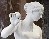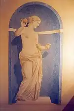 Connue par d’autres répliques[71], elle reproduirait l’Aphrodite de Thespies, œuvre disparue d’un des plus grands sculpteurs grecs classiques, Praxitèle[72], réalisée vers 360 av. J.-C., dont le modèle était sa maîtresse, la courtisane Phryné[73]. En dehors de ses qualités plastiques propres, c'est aussi ce qui lui donne de l'importance puisque Praxitèle n'a pas laissé beaucoup de traces de son œuvre, sinon dans la littérature, ce qui corrélativement incite à être prudent sur cette attribution.