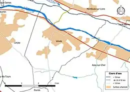 Le Cher, d'une longueur totale de 365,5 km, prend sa source à 714 mètres d'altitude à Mérinchal, dans la Creuse et se jette dans la Loire à Villandry, à 40 m d'altitude, après avoir traversé 117 communes[4]. Le Cher présente des fluctuations saisonnières de débit assez marquées. Sur le plan de la prévision des crues, la commune est située dans le tronçon du Cher tourangeau[5], dont la station hydrométrique de référence la plus proche est située à Tours [Pont Saint Sauveur]. Le débit mensuel moyen (calculé sur 53 ans pour cette station) varie de 25,8 m3/s au mois d'août à 192 m3/s au mois de février. Le débit instantané maximal observé sur cette station est de 1 000 m3/s le , la hauteur maximale relevée a été de 4,96 m le [6],[7]. Ce cours d'eau est classé dans les listes 1[Note 1] et 2[Note 2] au titre de l'article L. 214-17 du code de l'environnement sur le Bassin Loire-Bretagne. Au titre de la liste 1, aucune autorisation ou concession ne peut être accordée pour la construction de nouveaux ouvrages s'ils constituent un obstacle à la continuité écologique et le renouvellement de la concession ou de l'autorisation des ouvrages existants est subordonné à des prescriptions permettant de maintenir le très bon état écologique des eaux. Au titre de la liste 2, tout ouvrage doit être géré, entretenu et équipé selon des règles définies par l'autorité administrative, en concertation avec le propriétaire ou, à défaut, l'exploitant[8],[9]. Sur le plan piscicole, le Cher est classé en deuxième catégorie piscicole. Le groupe biologique dominant est constitué essentiellement de poissons blancs (cyprinidés) et de carnassiers (brochet, sandre et perche)[10].
