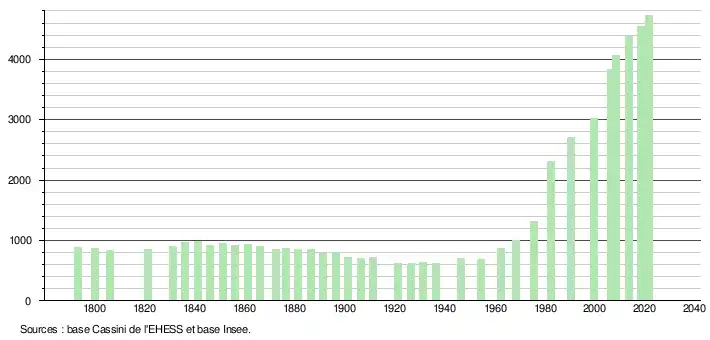 L'évolution du nombre d'habitants est connue à travers les recensements de la population effectués dans la commune depuis 1793. Pour les communes de moins de 10 000 habitants, une enquête de recensement portant sur toute la population est réalisée tous les cinq ans, les populations légales des années intermédiaires étant quant à elles estimées par interpolation ou extrapolation[35]. Pour la commune, le premier recensement exhaustif entrant dans le cadre du nouveau dispositif a été réalisé en 2008[36].