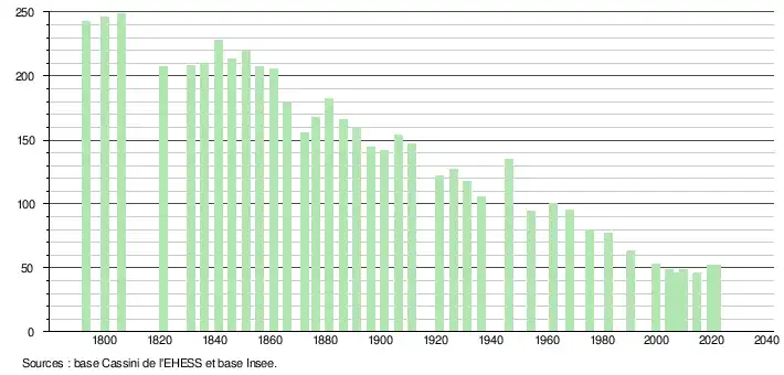 L'évolution du nombre d'habitants est connue à travers les recensements de la population effectués dans la commune depuis 1793. Pour les communes de moins de 10 000 habitants, une enquête de recensement portant sur toute la population est réalisée tous les cinq ans, les populations légales des années intermédiaires étant quant à elles estimées par interpolation ou extrapolation[15]. Pour la commune, le premier recensement exhaustif entrant dans le cadre du nouveau dispositif a été réalisé en 2004[16].