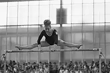 Věra Čáslavská aux barres asymétriques (gymnastique artistique féminine) lors des championnats d'Europe (1967).