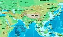 - 767-787 : raids de troupes venues par mer de Java sur les côtes Indochinoises (Champā)[20] (inscription de Kanjuraha ou Dinaja, à Java). Au milieu du siècle, le territoire du Cambodge, morcelé en principautés, tombe sous la suzeraineté de Java[21]. Construction de sanctuaires dédiés à Shiva sur le plateau de Dieng et du temple de Borobudur bouddhique dans le centre de l'île de Java.