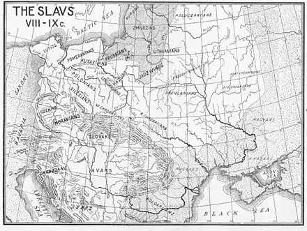 - Les peuples baltes sont répartis entre la Vistule et le golfe de Finlande. Les Prussiens (Pruzzen) entre la Vistule et le Niémen, proche des Lituaniens, les Lituaniens, divisés en tribus nombreuses (dont les Schmudes, en Samogitie), dans le bassin du Niémen, les Lettons (Lettgalles, Zemgales, Seles) autour du golfe de Rīga, les Lives et les Estes au nord, jusqu’au golfe de Finlande, Finno-ougriens apparentés aux tribus finlandaises. Des commerçants et aventuriers scandinaves colonisent la région des pays baltes à partir du VIIe siècle, puis remontent les fleuves comme la Dvina, la Bérézina, le Dniepr pour atteindre Constantinople au IXe siècle. La chronique de Nestor (vers 1115) énumère les peuples baltes ayant payé tribut au prince de Kiev : les Lives, les Samigotes, les Pruzzes et les Čud (Estes)[33].