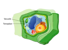La vacuole est un organite présent dans la cellule végétale, les pollens, les cellules fongiques et plus généralement toutes les cellules des différentes lignées d’eucaryotes photosynthétiques[1] et dans certaines cellules animales. Les vacuoles sont des compartiments délimités par une membrane (tonoplaste), remplis d'eau et contenant diverses molécules inorganiques et organiques telles que des enzymes. La vacuole n'a pas de forme ou de taille particulière, sa structure variant en fonction des besoins de la cellule. La vacuole se différencie de la vésicule par sa taille et sa fonction, malgré des similitudes au niveau des fonctions.