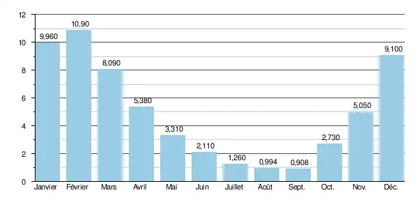 Le Vair présente les fluctuations saisonnières de débit assez importantes et typiques de l'est de la France, avec des crues d'hiver et de début de printemps portant le débit mensuel moyen entre 8,08 et 10,9 m3/s, de décembre à mars inclus (maximum en février), et des basses eaux d'été de juillet à septembre, avec une baisse du débit moyen mensuel jusqu'au niveau de 0,908 m3/s au mois de septembre.