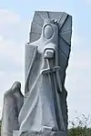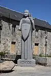 | 51 | Eodez[91] | 2015 | Didier Hardellet | Statue de 4,20 m en granit bleu de Lanhélin. Haude, ou Eodez, sainte céphalophore victime des accusations de mauvaise conduite portées contre elle par une marâtre jalouse, elle est décapitée par son frère Tanguy. Lorsque ce dernier va confesser son crime à ses parents, Eodez revient au château familial, sa tête entre les mains. La marâtre est foudroyée par la tonnerre et mordue par un serpent tandis que la sainte reçoit les derniers sacrements[92]. | ![]() |