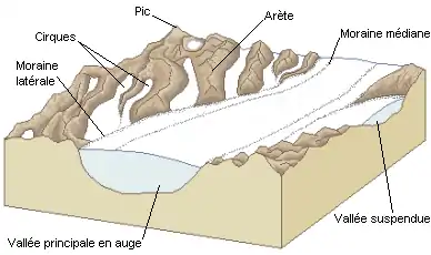 La plupart des vallées affluentes d’une vallée glaciaire débouchent au-dessus du fond de la vallée principale : on dit que ce sont des vallées suspendues. Le cours des rivières postglaciaires franchit ce gradin de confluence[5] par une gorge dite « de raccordement » ou par une cascade (vallée de Lauterbrunnen, dans l’Oberland bernois), lorsque la lithologie est homogène. Il est même possible que la vallée qui apparaît aujourd’hui comme la vallée principale ait été une vallée secondaire durant les glaciations pléistocènes, à l’image de la Romanche et du Vénéon, de l’Arc et du Doron de Termignon ou de la Durance et de la Gyronde. Ces vallées suspendues sont nettement moins creusées que les vallées principales et possèdent souvent un profil « en V ». Il est également possible qu’une grande vallée s’achève sur un ensemble de vallées suspendues comme la vallée de Chamonix en amont de Passy où le val Montjoie sont suspendues. On remarquera dans un premier temps, que les vallées suspendues sont liées à des glaciers moins puissants que le glacier principal. Cependant, il existe plusieurs cas de vallées suspendues :