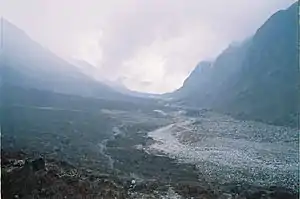 - un remblaiement fluvio-glaciaire ou glacio-lacustre, lié au barrage constitué par le glacier. Il forme alors une banquette ou une plaine alluviale.