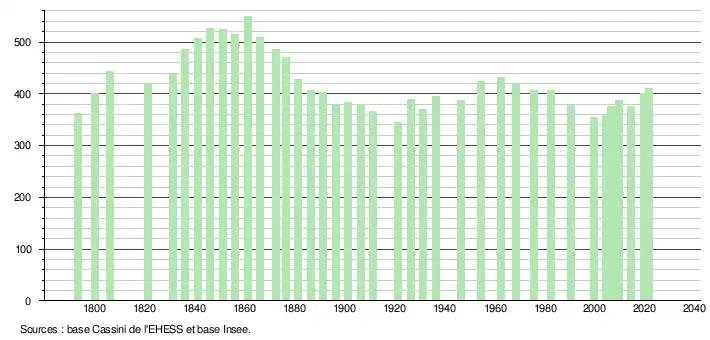 L'évolution du nombre d'habitants est connue à travers les recensements de la population effectués dans la commune depuis 1793. Pour les communes de moins de 10 000 habitants, une enquête de recensement portant sur toute la population est réalisée tous les cinq ans, les populations légales des années intermédiaires étant quant à elles estimées par interpolation ou extrapolation[22]. Pour la commune, le premier recensement exhaustif entrant dans le cadre du nouveau dispositif a été réalisé en 2004[23].