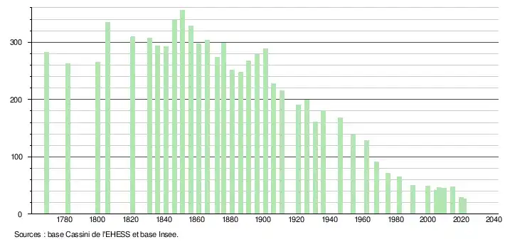 L'évolution du nombre d'habitants est connue à travers les recensements de la population effectués dans la commune depuis 1769. Pour les communes de moins de 10 000 habitants, une enquête de recensement portant sur toute la population est réalisée tous les cinq ans, les populations légales des années intermédiaires étant quant à elles estimées par interpolation ou extrapolation[7]. Pour la commune, le premier recensement exhaustif entrant dans le cadre du nouveau dispositif a été réalisé en 2004[8].