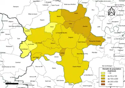 Carte des densités de population (millésimée 2016) des communes de l'intercommunalité Vallons de Haute-Bretagne Communauté. Composition en communes au [3].