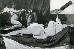 Le 10 mars 1914, la suffragette Mary Richardson entre dans la National Gallery de Londres et attaque le tableau Vénus à son miroir de Diego Velázquez avec un couperet à viande. Son action est provoquée par l'arrestation la veille de la suffragette Emmeline Pankhurst bien qu'il y ait eu des avertissements antérieurs d'une attaque planifiée contre la collection[10]. Richardson laisse sept entailles sur la peinture, qui sont toutes réparées avec succès[10],[11],[12]. Richardson est condamnée à six mois d'emprisonnement, le maximum autorisé pour la destruction d'une œuvre d'art[13]. Dans une déclaration à la Women's Social and Political Union peu de temps après, Richardson explique : "J'ai essayé de détruire l'image de la plus belle femme de l'histoire mythologique en guise de protestation contre le gouvernement pour avoir détruit Mme. Pankhurst, qui est le plus beau personnage de l'histoire moderne"[12].
