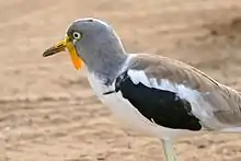 Tout comme le vanneau du Sénégal, le vanneau à tête blanche porte des caroncules.
