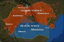 - Les linguistes qui ont initié la dialectologie du roumain, comme Gustav Weigand (de), Ovid Densușianu, Sextil Pușcariu, Alexandru Rosetti, Theodor Capidan (en), etc., et la plupart des linguistes roumains des XXe et XXIe siècles considèrent que les quatre idiomes romans orientaux (roumain de Roumanie et Moldavie, aroumain, mégléno-roumain et istro-roumain des Balkans) sont des dialectes d'une seule langue : le roumain. Ils dénomment « daco-roumain » le roumain de Roumanie et Moldavie quand ils le pensent nécessaire. Pour eux, le daco-roumain se subdivise en ce qu'ils appellent des subdialecte (« sous-dialectes ») ou graiuri (« parlers »)[1]. On utilisait encore le terme grai (au singulier) dans ce sens vers la fin du XXe siècle[2], mais les auteurs du XXIe siècle l'ont abandonné pour subdialect, et utilisent grai pour ses subdivisions[3].