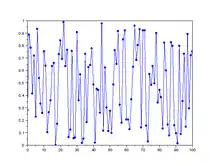 Cet algorithme est chaotique dans le sens où un petit changement de la valeur initiale entraine des résultats différents[34]. Sous de bonnes conditions sur et , les valeurs de la suite sont considérées comme des réalisations de variables iid. Par exemple, et donnent de bons résultats ; la valeur de la graine peut être choisie aléatoirement en utilisant l'horloge interne de l'ordinateur par exemple. Les valeurs pseudo-aléatoires obtenues prennent les valeurs de manière équiprobable, ainsi en divisant par la grande valeur , on obtient des valeurs considérées uniformes sur [31].