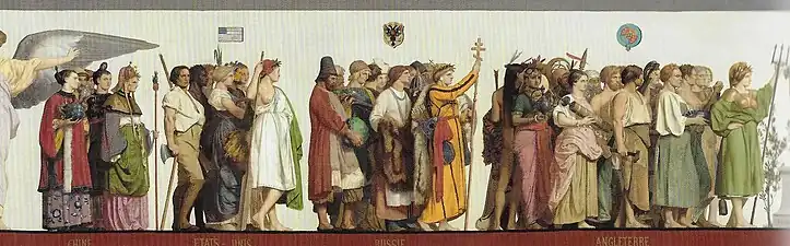 La Frise destinée à être reproduite sur le vase commémoratif de l'exposition de Londres de Gérôme, dite aussi « Les Quatre Parties du monde présentant leurs productions à la première exposition internationale de Londres en 1851 », est une huile sur toile de 55 × 310 cm conservée dans un premier temps à la manufacture. Elle est déposée au musée d'Orsay à Paris en 1980[3]. Gérôme a été inspiré par la fresque de l'hémicycle d'honneur de l'école des Beaux-arts peinte par son mentor Paul Delaroche[2].