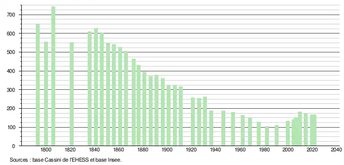 L'évolution du nombre d'habitants est connue à travers les recensements de la population effectués dans la commune depuis 1793. Pour les communes de moins de 10 000 habitants, une enquête de recensement portant sur toute la population est réalisée tous les cinq ans, les populations légales des années intermédiaires étant quant à elles estimées par interpolation ou extrapolation[15]. Pour la commune, le premier recensement exhaustif entrant dans le cadre du nouveau dispositif a été réalisé en 2004[16].