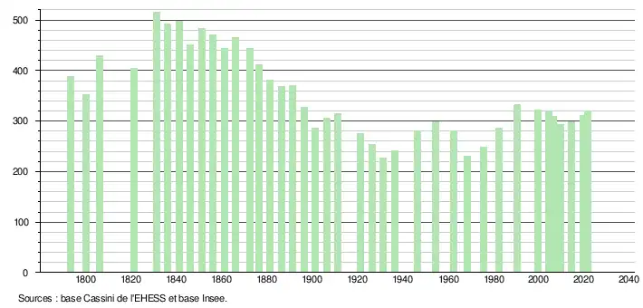 L'évolution du nombre d'habitants est connue à travers les recensements de la population effectués dans la commune depuis 1793. Pour les communes de moins de 10 000 habitants, une enquête de recensement portant sur toute la population est réalisée tous les cinq ans, les populations légales des années intermédiaires étant quant à elles estimées par interpolation ou extrapolation[35]. Pour la commune, le premier recensement exhaustif entrant dans le cadre du nouveau dispositif a été réalisé en 2004[36].