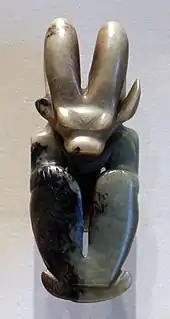 - Vers 4500–3000 av. J.-C. : culture néolithique de Hongshan, dans la région du fleuve Liao, au nord-est[22], caractérisée par une population dense, une organisation sociale complexe, des constructions monumentales et de nombreux objets rituels en jade. Le site de Niuheliang est composé de seize sanctuaires : esplanades-autels, cairns abritant des sépultures aristocratiques, construction pyramidale. Des restes d’effigies animales et féminines en terre cuite ont été découvertes dans une structure semi-souterraine dite « temple de la déesse », dont un visage grandeur nature avec des yeux de jade qui a pu être reconstitué. La culture de Hongshan disparait vers 3000 av. J.-C., en partie à cause d'un épisode climatique froid et sec. La culture de Xiaoheyan qui lui succède voit l’effondrement de la population et la disparition de la hiérarchie sociale[18].