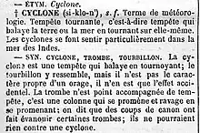 Exemple de vedette : l'entrée du mot « cyclone » (typographié ici en gras et en capitales) dans l'édition de 1863 du Littré.