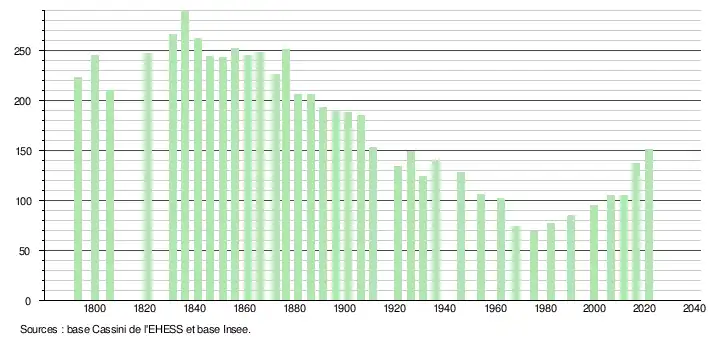 | L'évolution du nombre d'habitants est connue à travers les recensements de la population effectués dans la commune depuis 1793. Pour les communes de moins de 10 000 habitants, une enquête de recensement portant sur toute la population est réalisée tous les cinq ans, les populations légales des années intermédiaires étant quant à elles estimées par interpolation ou extrapolation[27]. Pour la commune, le premier recensement exhaustif entrant dans le cadre du nouveau dispositif a été réalisé en 2006[28]. En 2021, la commune comptait 151 habitants[Note 6], en augmentation de 18,9 % par rapport à 2015 (Tarn : +1,82 %, France hors Mayotte : +1,84 %). |