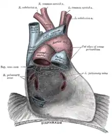 La portion thoracique de la veine cave inférieure est entourée d'une prolongation de péricarde fibreux, recouverte sur ses faces antérieure, gauche et droite par une séreuse péricardique. À droite elle est en rapport avec le ligament phréno-péricardique droit et le nerf phrénique droit.