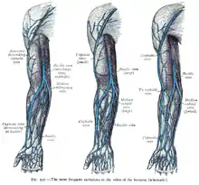 La veine cubitale médiane présente une large gamme de variations. Le plus souvent la veine forme un motif en H avec les veines céphalique et basilique constituant les côtés[2]. D'autres formes incluent un motif en M, où la veine se ramifie vers les veines céphalique et basilique[2], ou encore en Y, en W ou en N.