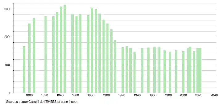 L'évolution du nombre d'habitants est connue à travers les recensements de la population effectués dans la commune depuis 1793. Pour les communes de moins de 10 000 habitants, une enquête de recensement portant sur toute la population est réalisée tous les cinq ans, les populations légales des années intermédiaires étant quant à elles estimées par interpolation ou extrapolation[19]. Pour la commune, le premier recensement exhaustif entrant dans le cadre du nouveau dispositif a été réalisé en 2008[20].