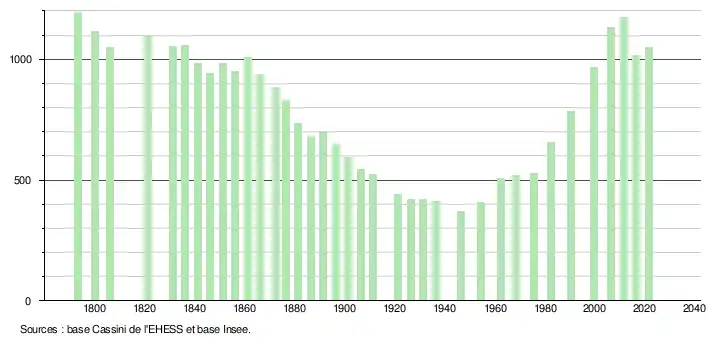 L'évolution du nombre d'habitants est connue à travers les recensements de la population effectués dans la commune depuis 1793. Pour les communes de moins de 10 000 habitants, une enquête de recensement portant sur toute la population est réalisée tous les cinq ans, les populations légales des années intermédiaires étant quant à elles estimées par interpolation ou extrapolation[21]. Pour la commune, le premier recensement exhaustif entrant dans le cadre du nouveau dispositif a été réalisé en 2006[22].