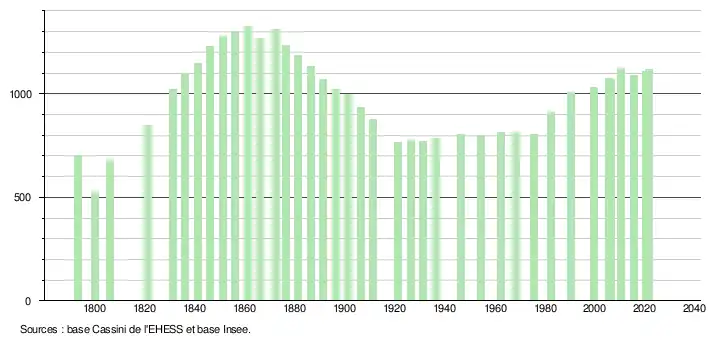 L'évolution du nombre d'habitants est connue à travers les recensements de la population effectués dans la commune depuis 1793. Pour les communes de moins de 10 000 habitants, une enquête de recensement portant sur toute la population est réalisée tous les cinq ans, les populations légales des années intermédiaires étant quant à elles estimées par interpolation ou extrapolation[48]. Pour la commune, le premier recensement exhaustif entrant dans le cadre du nouveau dispositif a été réalisé en 2005[49].