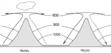 Circulation (flèches) et niveau de pression (tiretés) dans les brises de pente (anabatique du côté ensoleillé et catabatique du côté à l'ombre).