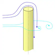 Une telle diminution n'est pas surprenante en Mécanique des fluides[réf. nécessaire] puisque le des corps suscitant un écoulement 3D est toujours beaucoup plus faible que le des corps suscitant un écoulement 2D, ceci parce qu'un corps suscitant un écoulement 3D offre toujours plus de voies à son contournement par le fluide qu'un corps suscitant un écoulement 2D[n 2] : le d'un cylindre court est donc forcément plus faible que celui du cylindre infini[réf. nécessaire].