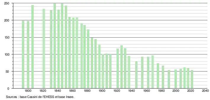 L'évolution du nombre d'habitants est connue à travers les recensements de la population effectués dans la commune depuis 1793. Pour les communes de moins de 10 000 habitants, une enquête de recensement portant sur toute la population est réalisée tous les cinq ans, les populations légales des années intermédiaires étant quant à elles estimées par interpolation ou extrapolation[17]. Pour la commune, le premier recensement exhaustif entrant dans le cadre du nouveau dispositif a été réalisé en 2006[18].