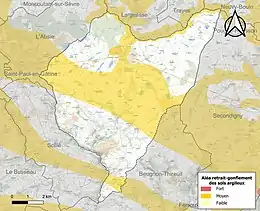 Les mouvements de terrains susceptibles de se produire sur la commune sont des tassements différentiels[18]. Le retrait-gonflement des sols argileux est susceptible d'engendrer des dommages importants aux bâtiments en cas d’alternance de périodes de sécheresse et de pluie[19]. 40,4 % de la superficie communale est en aléa moyen ou fort (54,9 % au niveau départemental et 48,5 % au niveau national)[Carte 2]. Depuis le , en application de la loi ELAN, différentes contraintes s'imposent aux vendeurs, maîtres d'ouvrages ou constructeurs de biens situés dans une zone classée en aléa moyen ou fort[Note 5],[20].