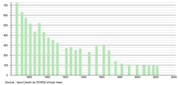 L'évolution du nombre d'habitants est connue à travers les recensements de la population effectués dans la commune depuis 1866. Pour les communes de moins de 10 000 habitants, une enquête de recensement portant sur toute la population est réalisée tous les cinq ans, les populations légales des années intermédiaires étant quant à elles estimées par interpolation ou extrapolation[33]. Pour la commune, le premier recensement exhaustif entrant dans le cadre du nouveau dispositif a été réalisé en 2007[34].