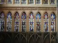 Les baies du registre supérieur sont plus élevées aux extrémités. Hautes de 6,55 mètres au centre, elles mesurent 9,20 mètres sur les côtés. Les figures ont toutes la même taille, seule la place occupée par l’architecture varie : elle occupe la moitié de la surface vitrée dans les baies extrêmes. De plus, à hauteur des redents, des motifs réticulés rouge-blanc et bleu-blanc complètent ces vitraux. Les quatre personnages latéraux ont un fond réticulé de ce type. Leurs dais architecturaux, à colonne, tourelles et pinacles, sont richement décorés. Des niches y sont animées de figures de saints, d’hommes en armes, de musiciens : à côté d’un page vielleur, sainte Barbe, saint Étienne, et sainte Cécile sont identifiés. Des anges, munis d’encensoirs, voltigent autour des pinacles. De nouveau, les personnages reposent sur des socles en perspective où sont inscrits leurs noms. Ces socles sont plus hauts dans la partie centrale, pour atténuer la sensation d’écrasement.