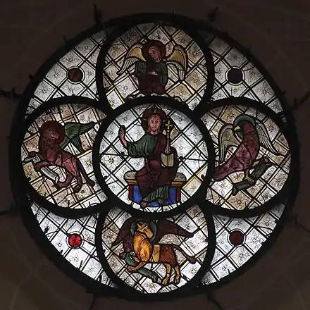 Le ferraillage de l’oculus est formé d'un cercle central, et de quatre cercles de même diamètre, disposés en croix, et rejoignant le cercle central à 45 degrés. Dans le cercle central figure un Christ bénissant ; les quatre cercles périphérique forment un tétramorphe figurant les quatre évangélistes : en haut, Matthieu l'évangéliste figuré par un ange ; en bas, un taureau représentant Luc ; à gauche le fameux lion de saint Marc ; et à droite l'aigle représentant Jean. Chacune de ces figures tient un parchemin ou un livre, symbole de son évangile.
